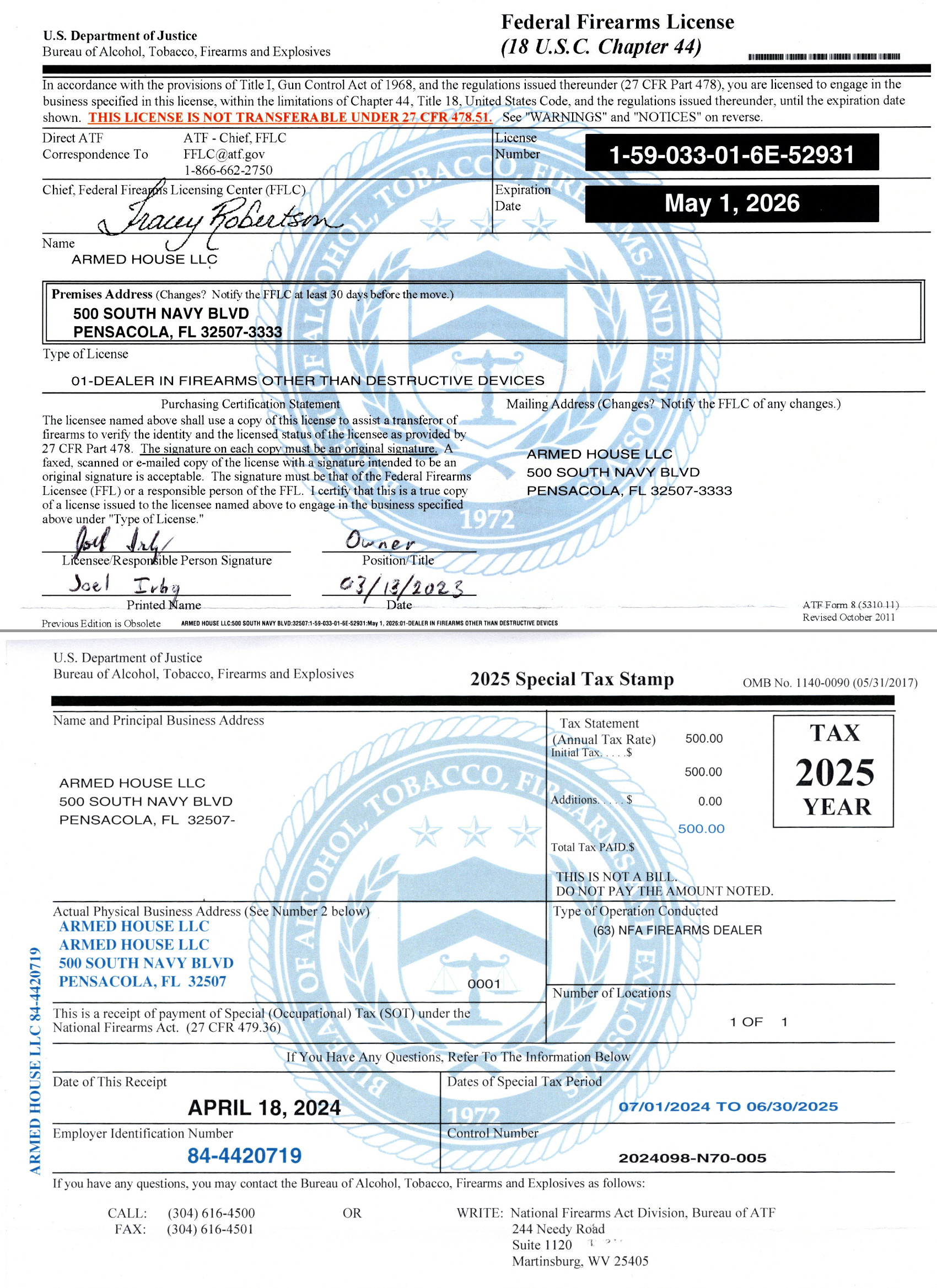 ARMED HOUSE LLC is available by appointment seven days a week as a firearms transfer agent, firearms dealer, and SOT in the Warrington area of West Pensacola, outside of NAS Pensacola. The FDLE FES background check system is available on weekends and federal holidays until 8pm Central Time, except for Christmas and New Years.